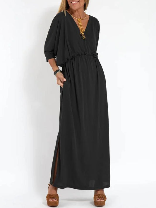 Ensfarget, uformell kjole med V-hals og glidelås for kvinner